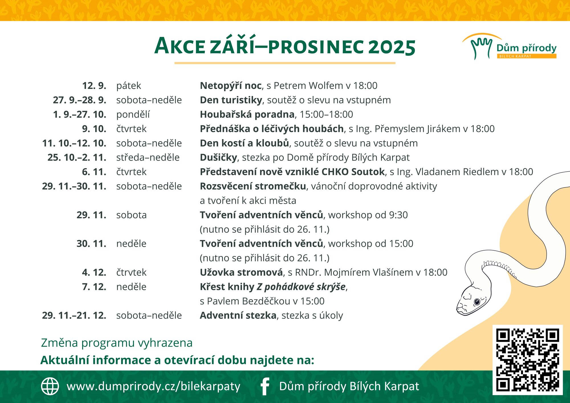 Akce Domu přírody Bílých Karpat Program akcí na září–prosinec 2025 ke stažení zde. Akce je propagována na webu: Kudy z nudy. Houbařská poradna Termín: 1. září 2025 — 27. října 2025Místo: Dům přírody Bílých Karpat Rádi chodíte na houby, ale občas si nejste zcela jistí, o jaký druh se jedná? Přijďte svůj úlovek zkonzultovat s mykologem Janem Jongepierem. Zpět Nahoru Tisk
