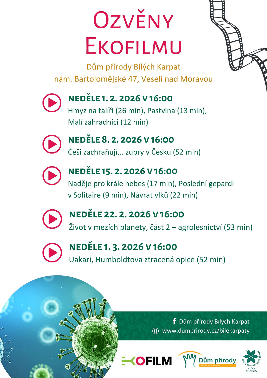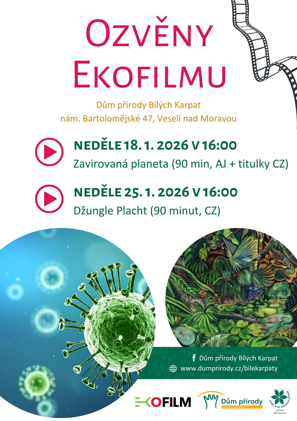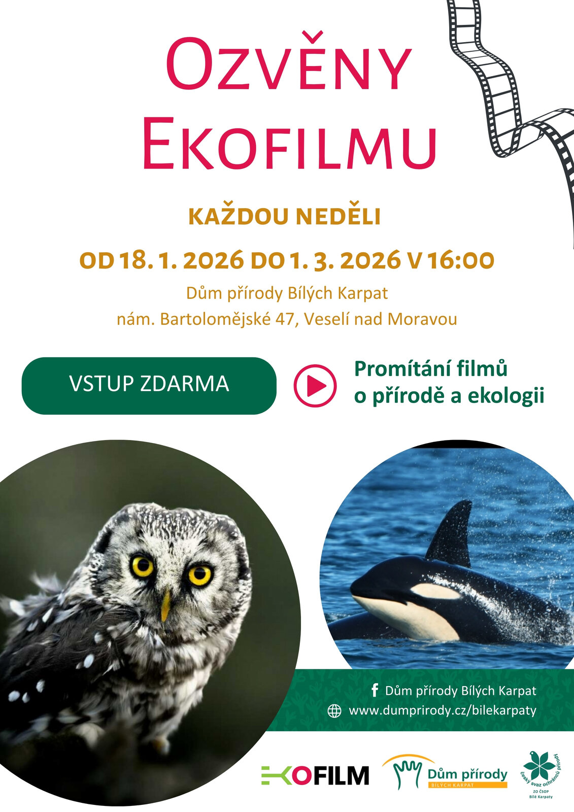 Zveme vás na akci Ozvěny EKOFILMU 2026, která potrvá od 18. 1. 2026 do 1. 3. 2026. Těšit se můžete na promítání filmů o přírodě a ekologii, a to každou neděli v 16:00.