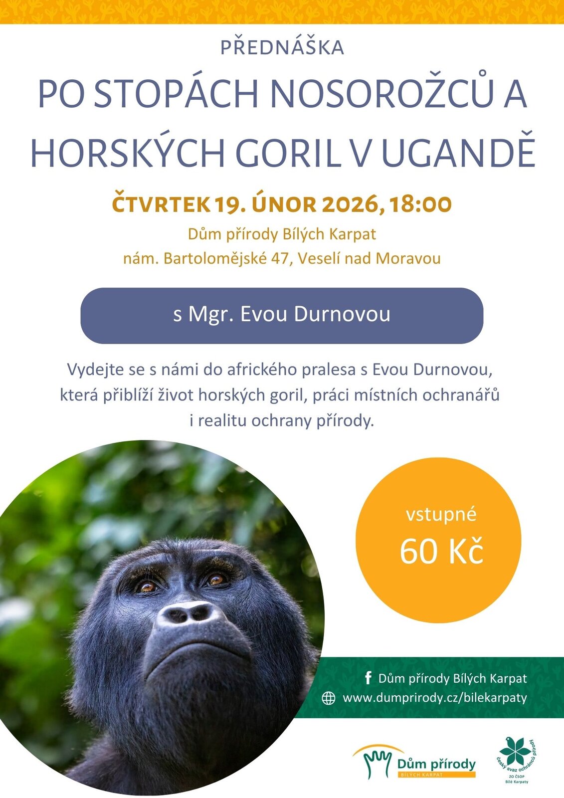 Vydejte se s námi ve čtvrtek 19. února 2026 v 18:00 do ugandských pralesů prostřednictvím osobního vyprávění Mgr. Evy Durnové z cesty, která se proměnila v silnou zkušenost. Přednáška přiblíží život horských goril, práci místních ochranářů i realitu ochrany přírody v oblastech, kde není samozřejmostí bezpečí – ani pro zvířata, ani pro lidi.