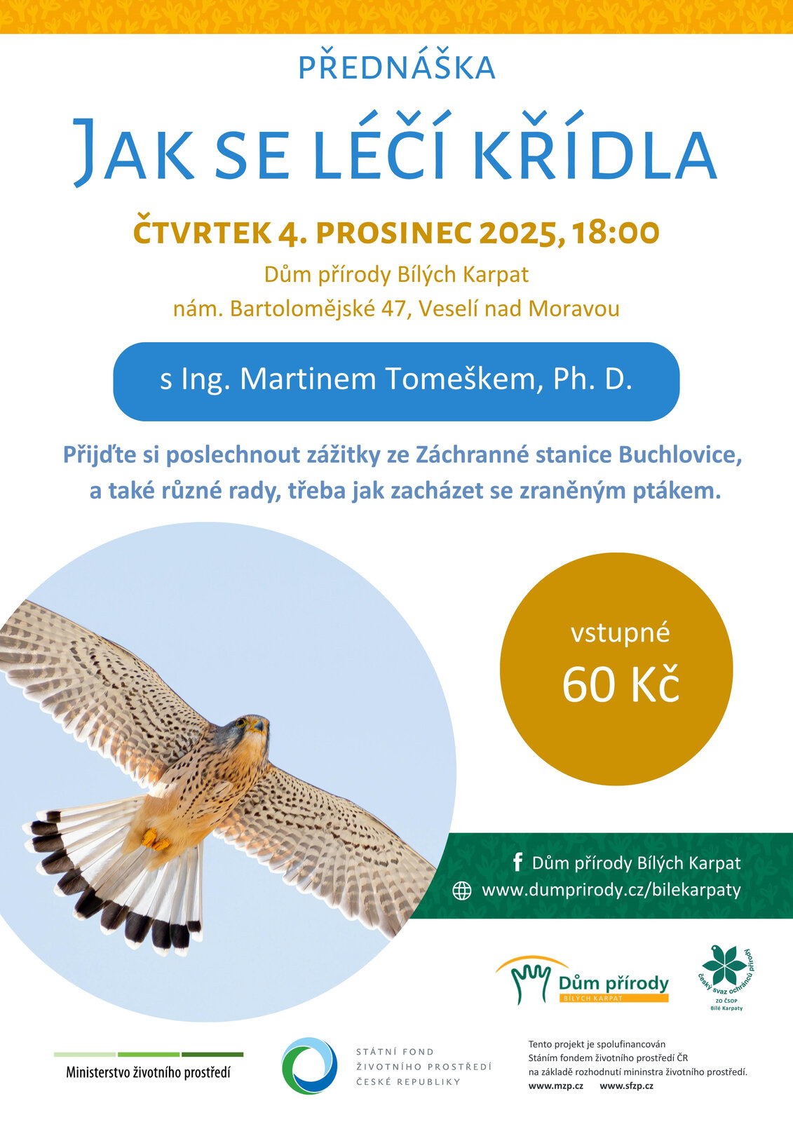 Zveme vás na čtvrteční přednášku 4. prosince v 18:00 s Ing. Martinem Tomeškem, na které si můžete poslechnout zážitky ze Záchranné stanice Buchlovice a také různé rady, třeba jak zacházet se zraněným ptákem.