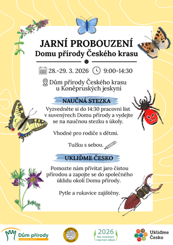 Srdečně vás zveme na Jarní probouzení Domu přírody Českého krasu, které se uskuteční 28.–29. března 2026 od 9:00 do 14:30 u Domu přírody Českého krasu u Koněpruských jeskyní.