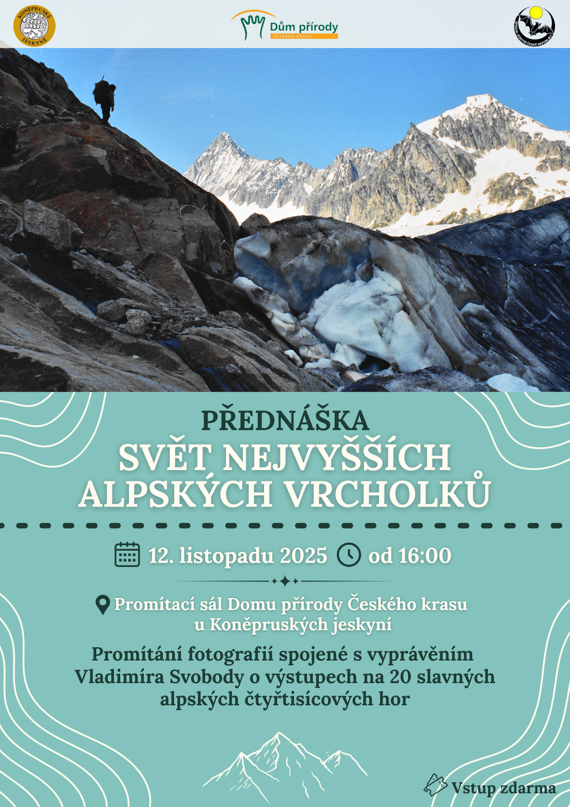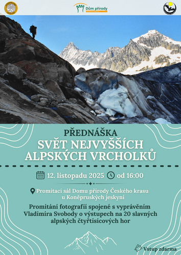 Ve středu 12. listopadu 2025 od 16:00 Vás zveme na promítání fotografií a vyprávění Vladimíra Svobody o výstupech na dvacet slavných alpských čtyřtisícovek. Vstupné zdarma.