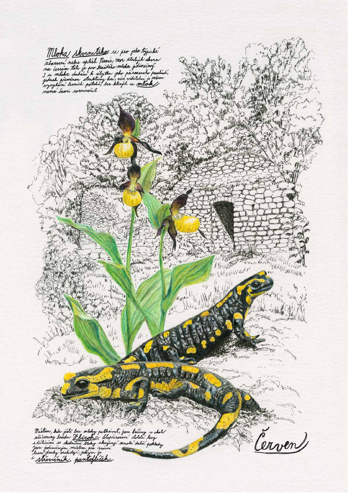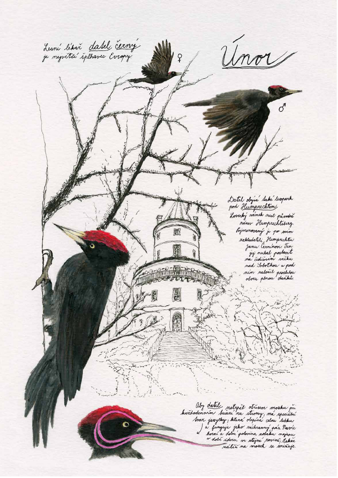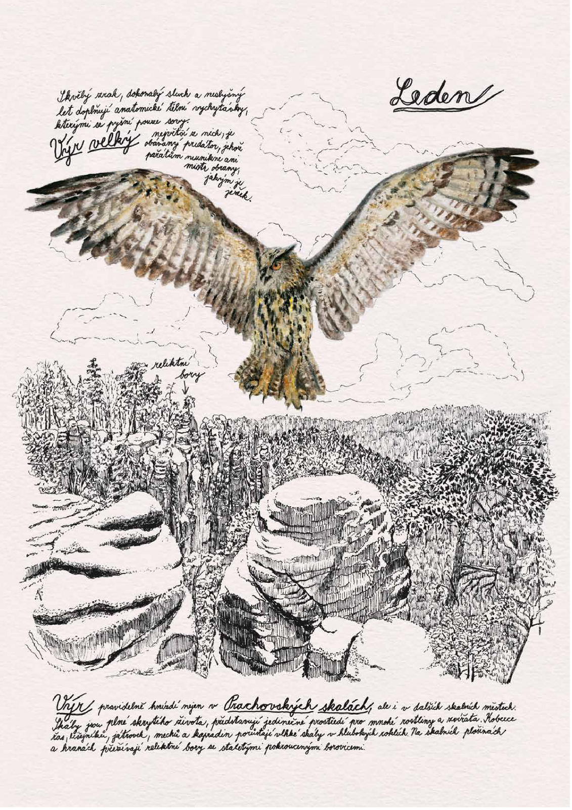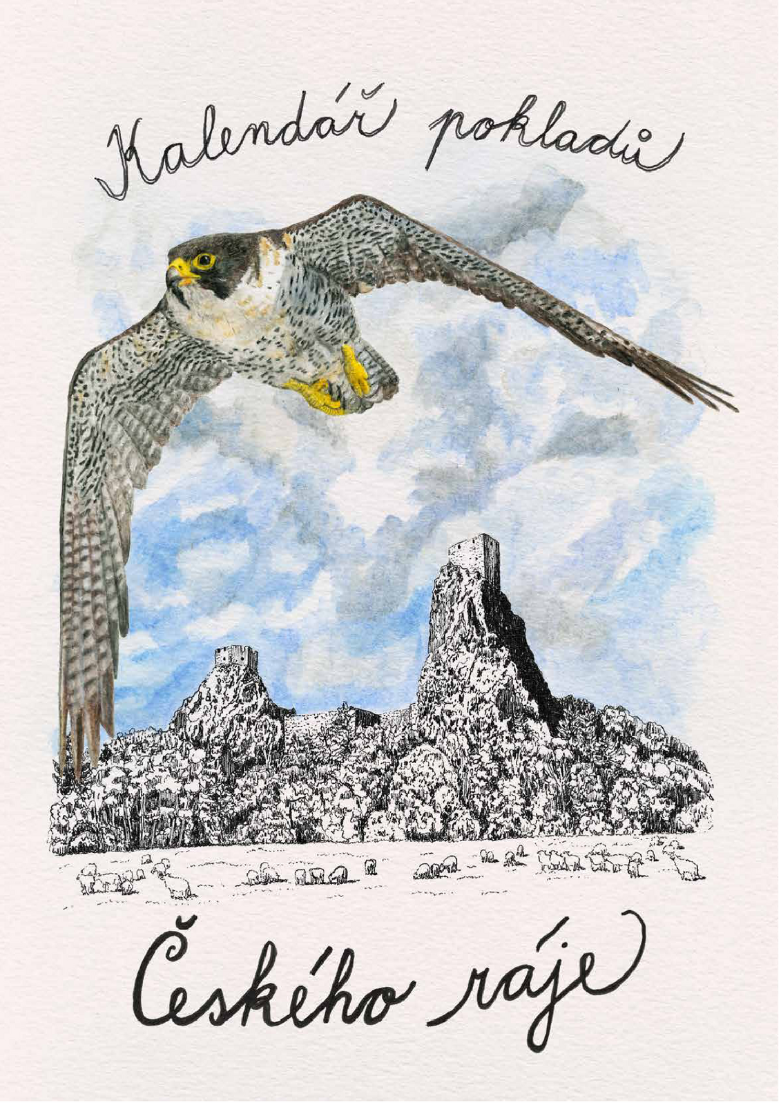 Na dvanácti stranách Kalendáře pokladů Českého ráje se s pomocí autorských kreseb a ručně psaného textu seznámíte s druhy, které jsou v Českém ráji doma a také s dominantami krajiny Českého ráje. V Prachovských skalách se v lednu setkáte s výrem velkým, v květnu na Mužském zase s otakárkem fenyklovým, pod hradem Valečov vás v srpnu čeká setkání ještěrkou obecnou.