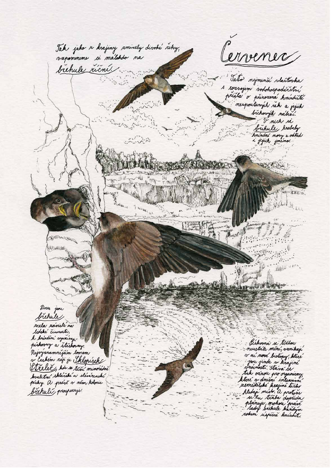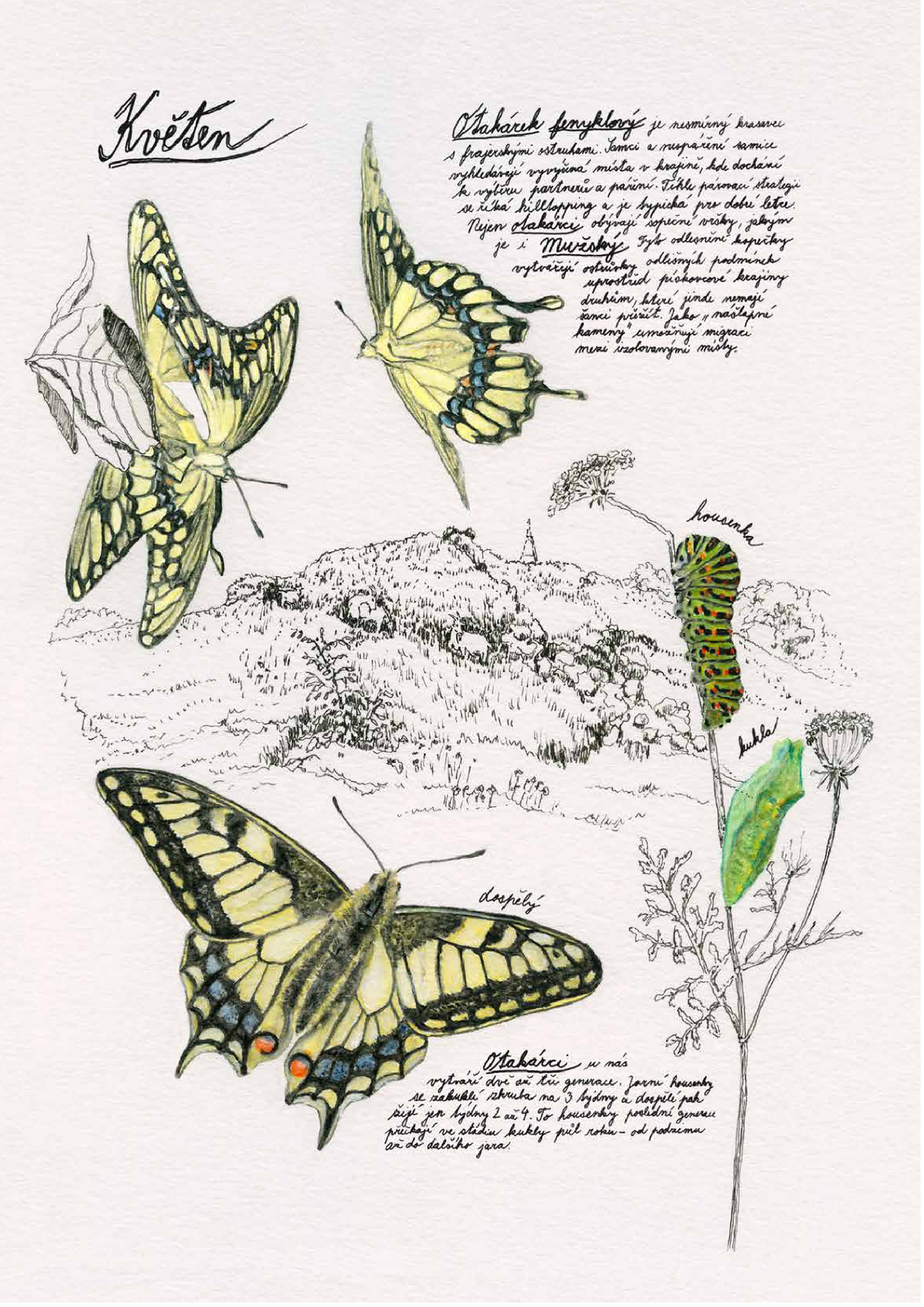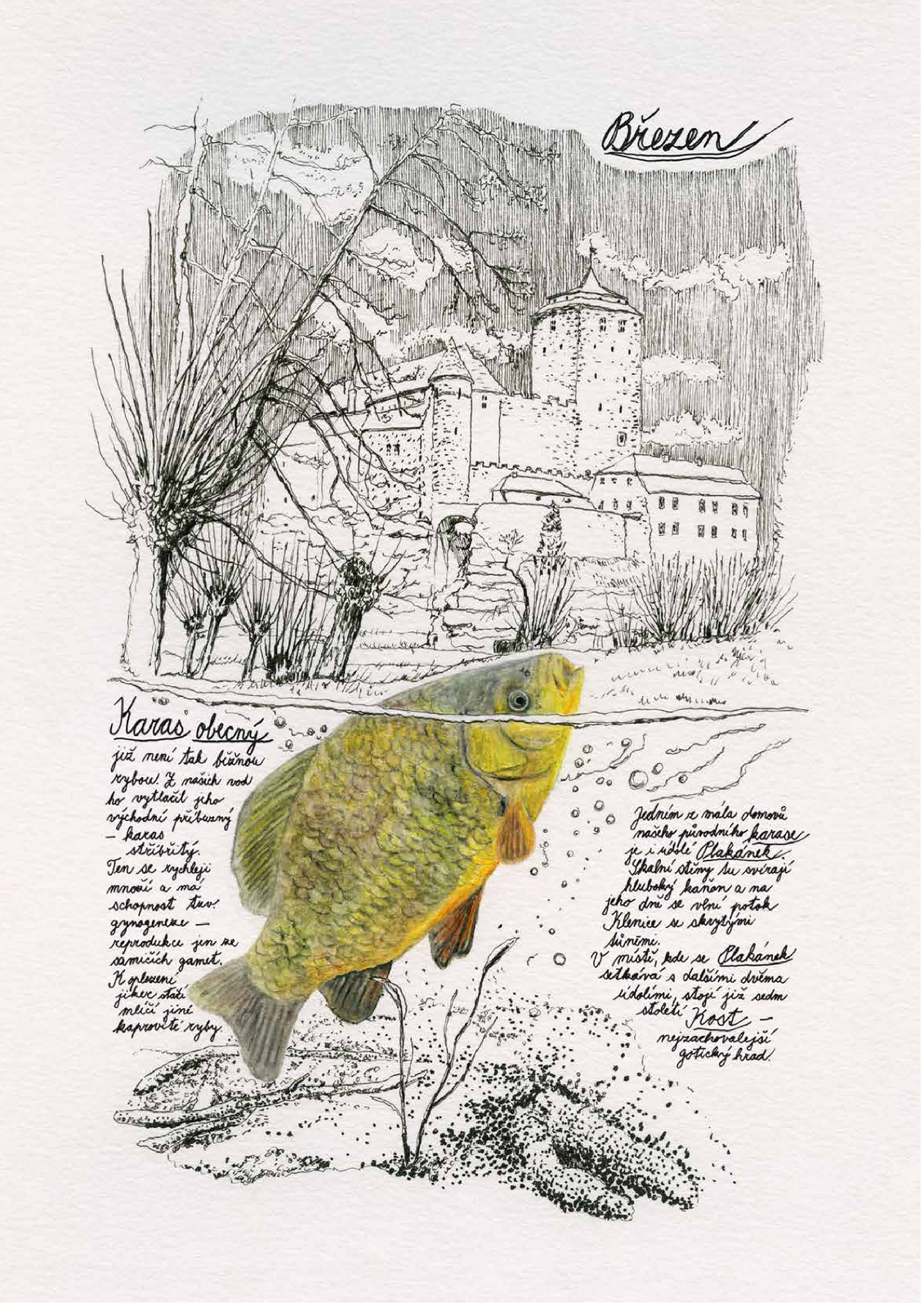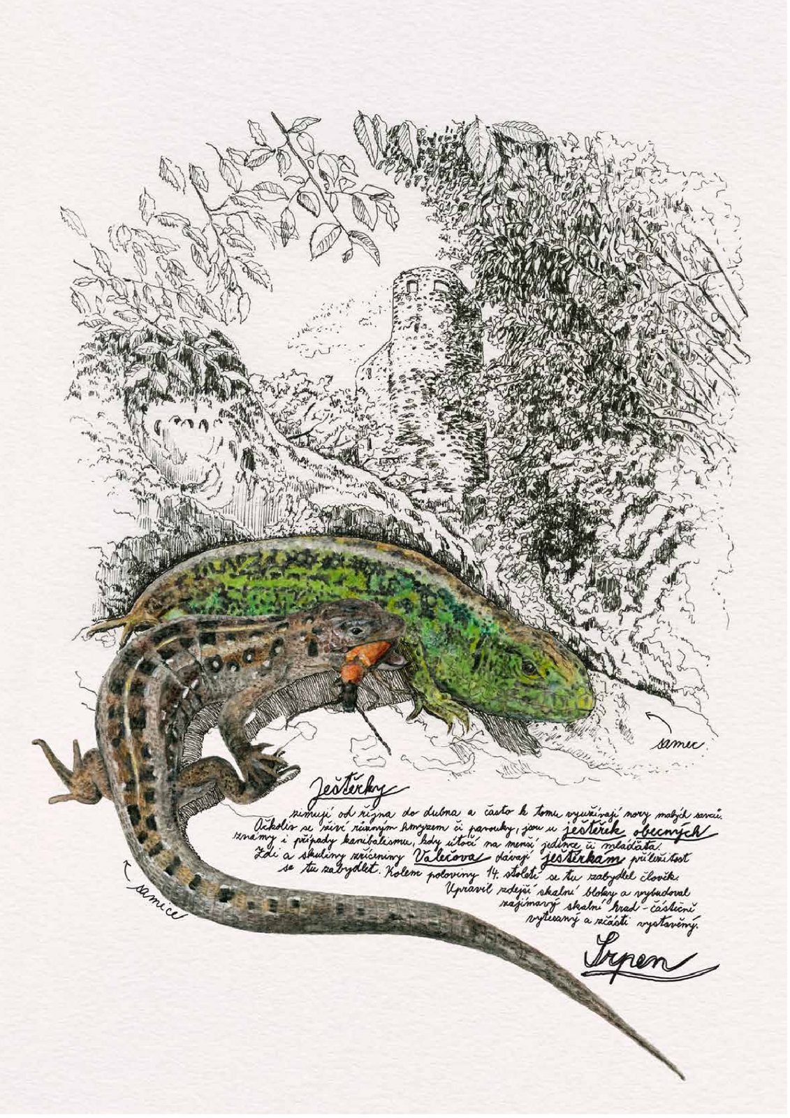 Na dvanácti stranách Kalendáře pokladů Českého ráje se s pomocí autorských kreseb a ručně psaného textu seznámíte s druhy, které jsou v Českém ráji doma a také s dominantami krajiny Českého ráje. V Prachovských skalách se v lednu setkáte s výrem velkým, v květnu na Mužském zase s otakárkem fenyklovým, pod hradem Valečov vás v srpnu čeká setkání ještěrkou obecnou.