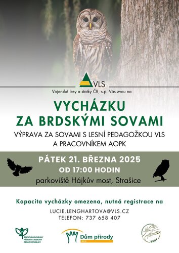 Rádi bychom vás pozvali na sérii vycházek za sovami. První ze čtyř plánovaných vycházek se koná v pátek 21. března, a to v CHKO Brdy v okolí Strašic. Další vycházky budou plánovány podle vhodného počasí a včas na ně upozorníme.