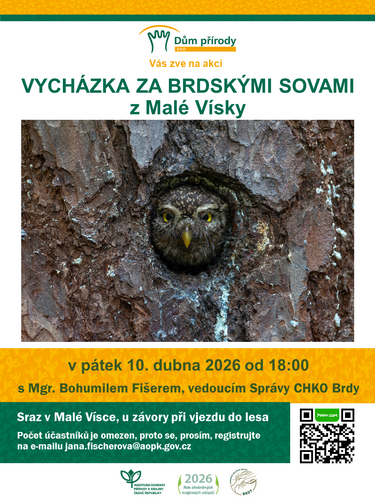 z Malé VískyVydejte se s námi znovu do kouzelných brdských lesů a objevte tajemný svět sov! Druhá z plánovaných vycházek se koná v pátek 10. dubna, a to v CHKO, v okolí Malé Vísky. Společně s vedoucím Správy CHKO Brdy Mgr. Bohumilem Fišerem vyrazíme do kouzelných brdských lesů v 18:00 hodin. Další vycházky budou plánovány podle vhodného počasí a včas na ně upozorníme.