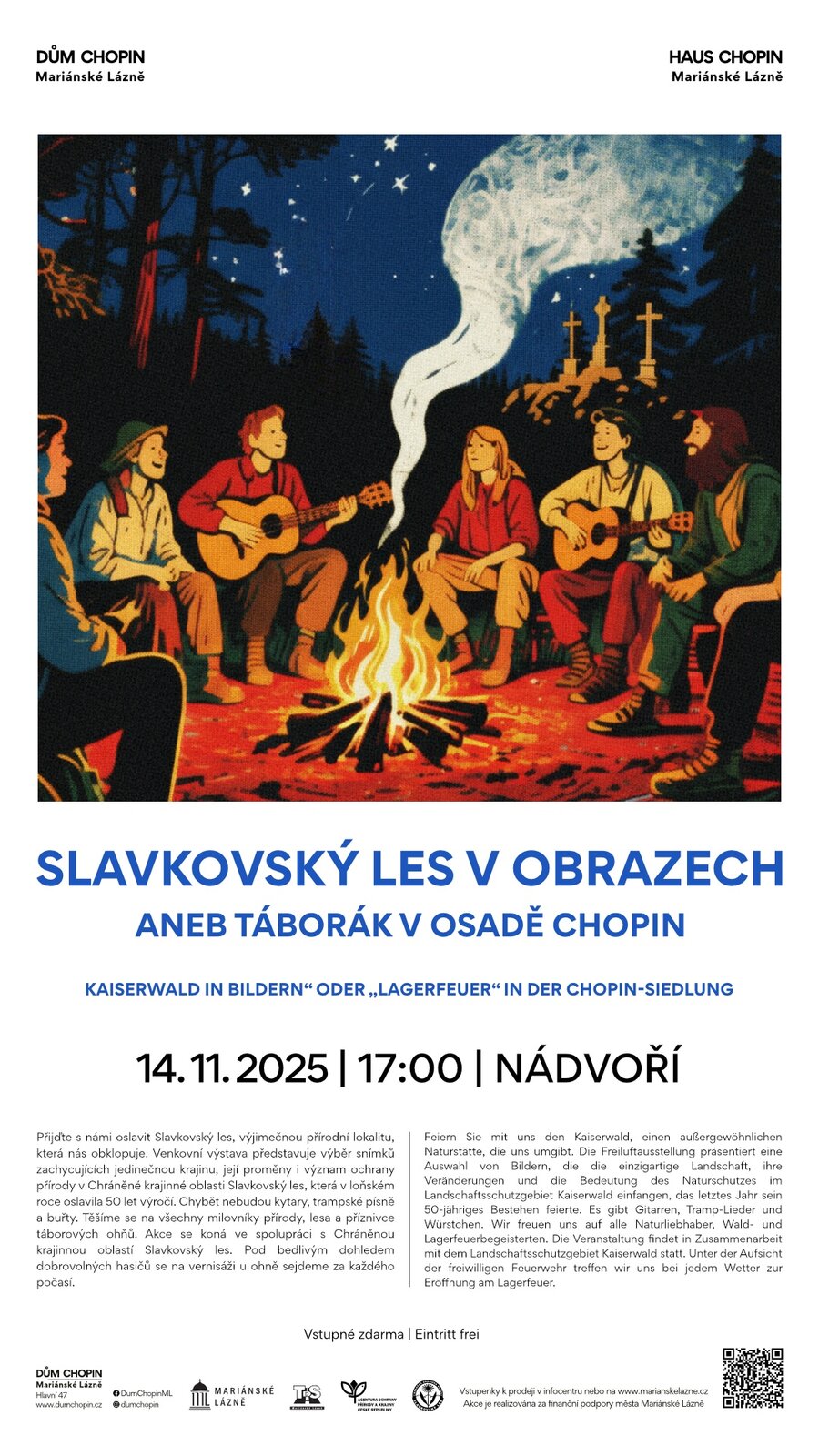Přijďte s námi oslavit Slavkovský les, výjimečnou přírodní lokalitu, která nás obklopuje. Venkovní výstava představuje výběr snímků zachycujících jedinečnou krajinu, její proměny i význam ochrany přírody v Chráněné krajinné oblasti Slavkovský les, která v loňském roce oslavila 50 let výročí. Chybět nebudou kytary, trampské písně a buřty. Těšíme se na všechny milovníky přírody, lesa a příznivce táborových ohňů. Akce se koná ve spolupráci s Domem Chopin.
