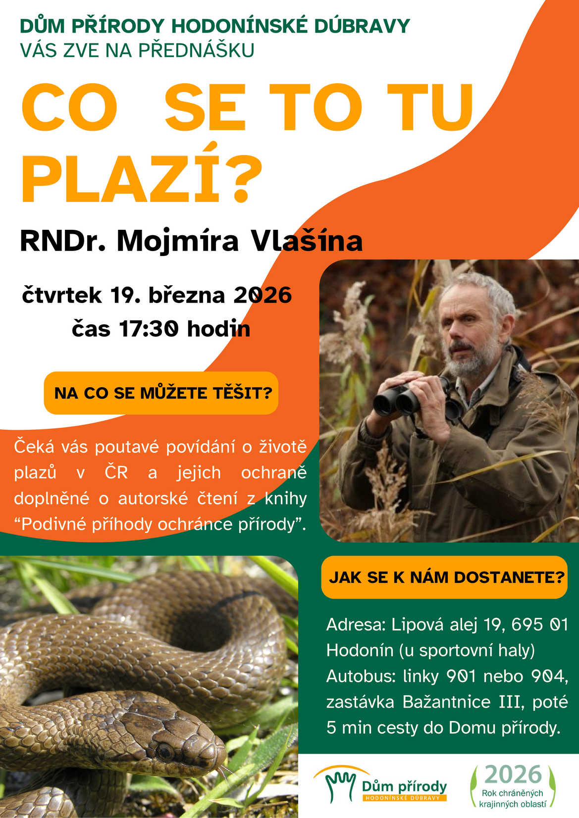 RNDr. Mojmír Vlašín vás provede fascinujícím světem plazů České republiky. Poutavé vyprávění zkušeného zoologa bude doplněno o autorské čtení z úspěšné knihy “Podivné příhody ochránce přírody”. Vstupné dobrovolné.