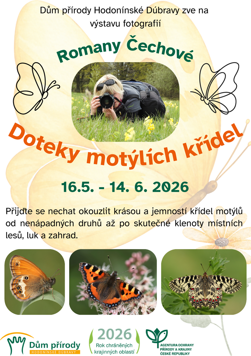 Výstava fotografií paní Romany Čechové vás zavede do světa jemných křídel, pestrých vzorů a prchavých okamžiků, které běžně unikají našemu zraku. Zachycené snímky představují motýly v jejich přirozeném prostředí — od nenápadných druhů až po skutečné klenoty našich luk a zahrad. Přijďte se nechat okouzlit jejich krásou zblízka.