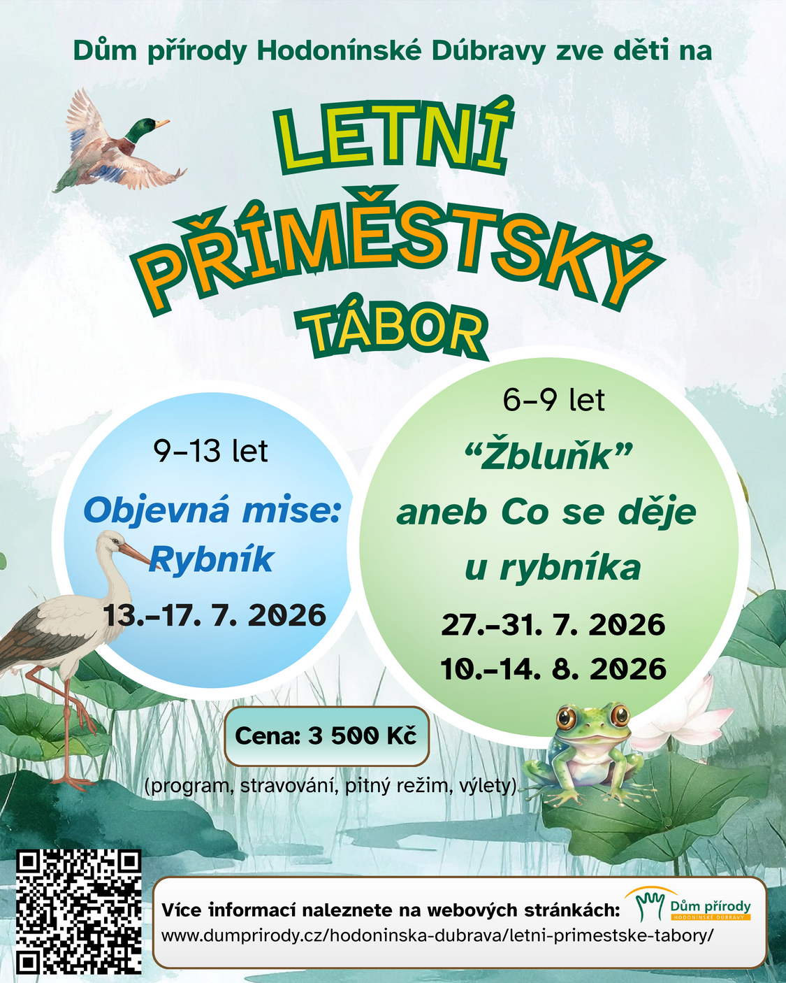 Zažijte s námi týden plný dobrodružství u hodonínských rybníků. Čeká nás prostředí, kde voda, les a louky vytvářejí ideální prostor pro hry, tvoření a objevování přírody zblízka. Pojďte s námi poznat, co se děje nad hladinou, pod vodou i v rákosí.
