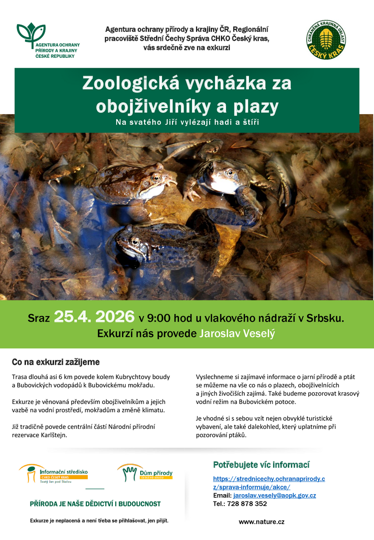 Jarní zoologická exkurze je věnovaná především obojživelníkům a jejich vazbě na vodní prostředí. Již tradičně povede centrální částí Národní přírodní rezervace Karlštejn.