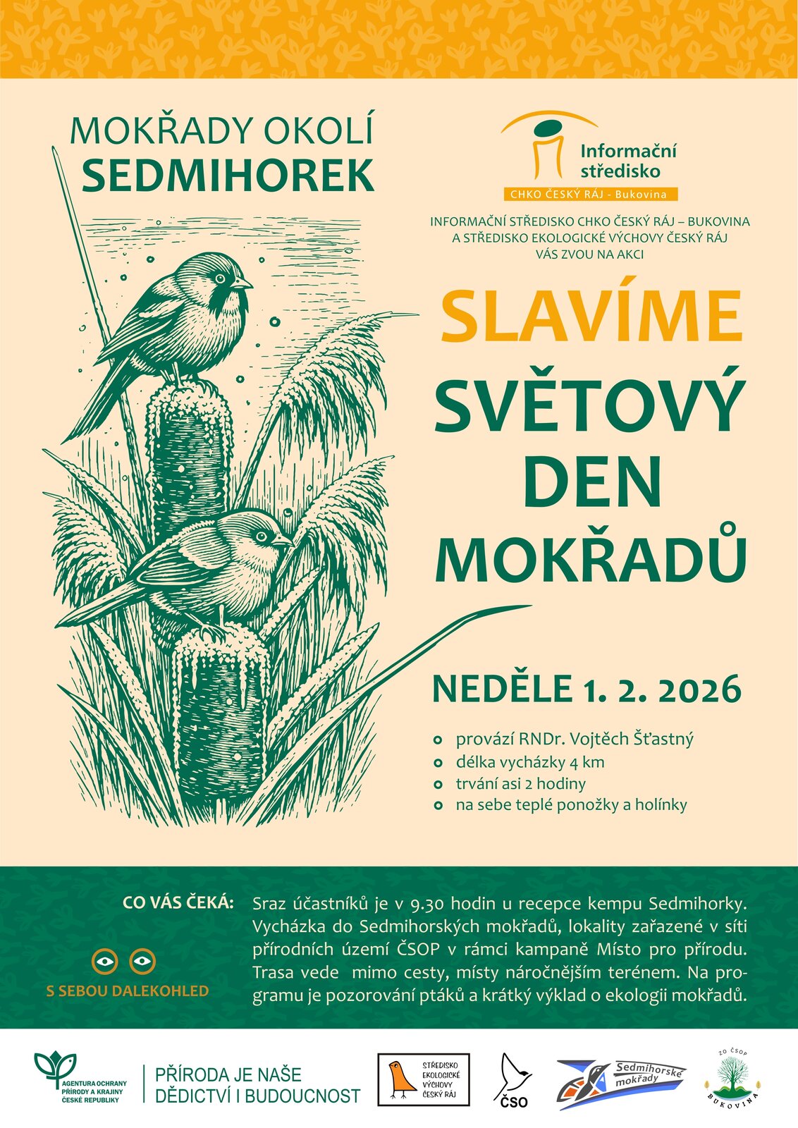 Sraz účastníků je v 9.30h u recepce kempu Sedmihorky. Vycházka nás zavede do Sedmihorských mokřadů, lokality zařazené v síti přírodních území ČSOP v rámci kampaně Místo pro přírodu.Trasa bude dlouhá 4km a vede mimo cesty, místy náročnějším terénem. Na sebe doporučujeme teplé ponožky a holínky, s sebou dalekohled. Na programu je pozorování ptáků a krátký výklad o ekologii mokřadů. Předpokládaná doba trvání vycházky je 2h. Provází RNDr. Vojtěch Šťastný