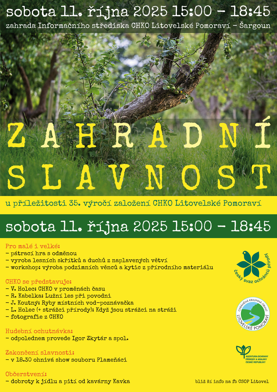 Akce Termín: 11. října 2025 od 15:00 do 18:45Místo: IS CHKO LP - Šargoun V zahradě na Šargouně proběhne oslava přírody u příležitosti 35. výročí CHKO Litovelské Pomoraví. Připraveny jsou aktivity pro děti, workshopy, přednášky, hudba, občerstvení. Zpět Nahoru Tisk