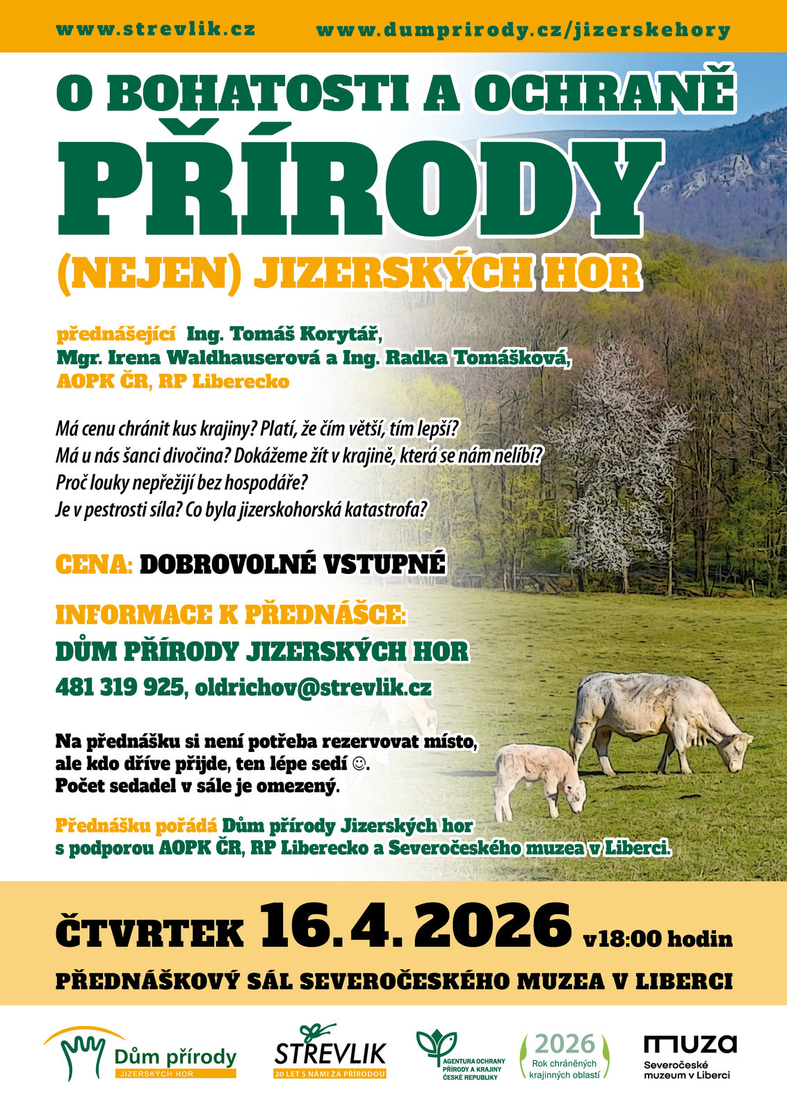 Přednášku pořádá Dům přírody Jizerských hor s podporou AOPK ČR, RP Liberecko a Severočeského muzea v Liberci.