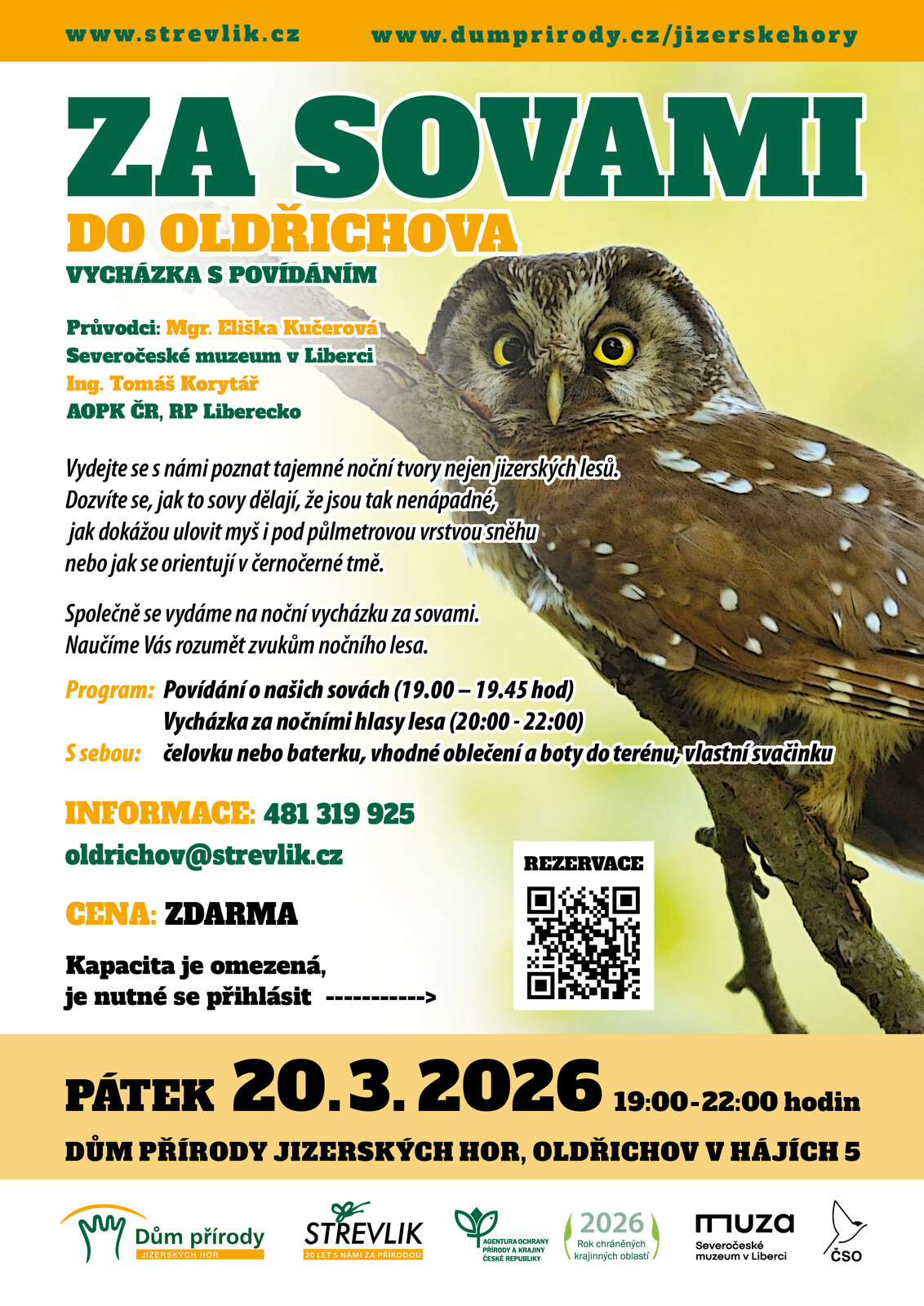 Vydejte se s námi poznat tajemné noční tvory nejen jizerských lesů. Zveme vás na povídání o ptácích s výjimečnými schopnostmi. Dozvíte se, jak to sovy dělají, že jsou tak nenápadné, jak dokážou ulovit myš i pod půlmetrovou vrstvou sněhu nebo jak se orientují v černočerné tmě. Společně se vydáme na noční vycházku za sovami, u kterých právě probíhají námluvy. Naučíme Vás rozumět zvukům nočního lesa.