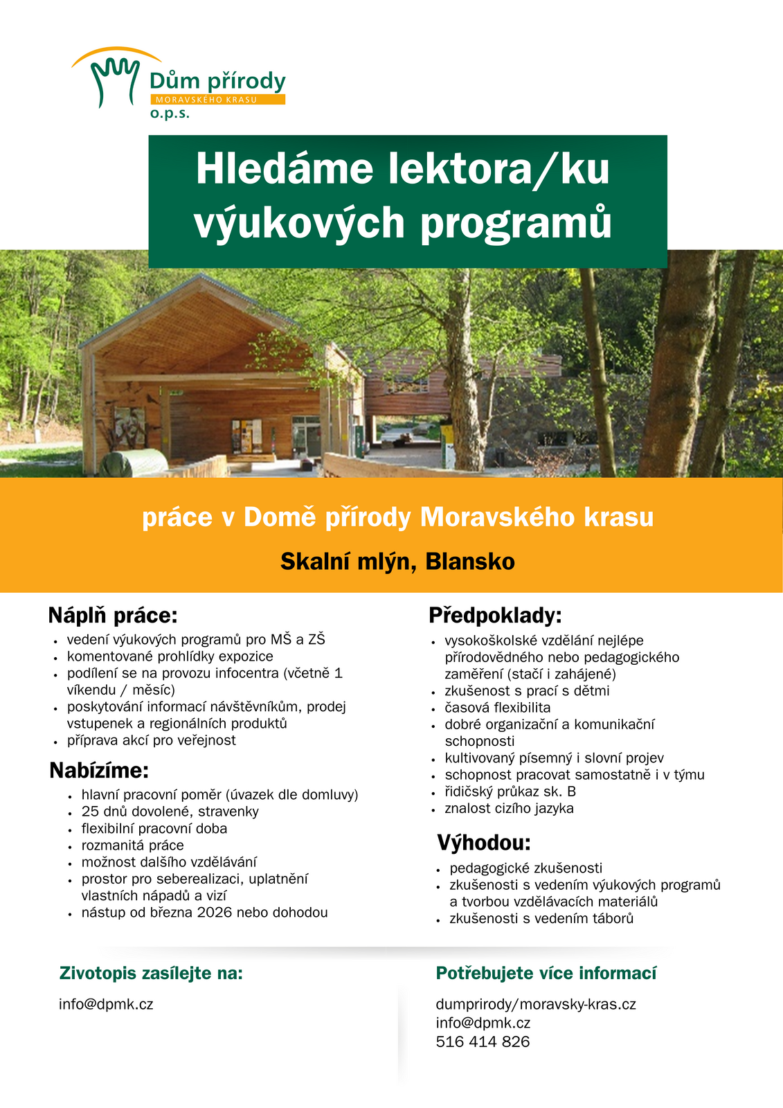 Výběrové řízení 2026 Termín: 13. ledna 2026 — 31. března 2026Místo: Dům přírody Moravského krasu, Skalní mlýn Nabízíme volné pracovní místo lektora/lektorky. Zpět Nahoru Tisk