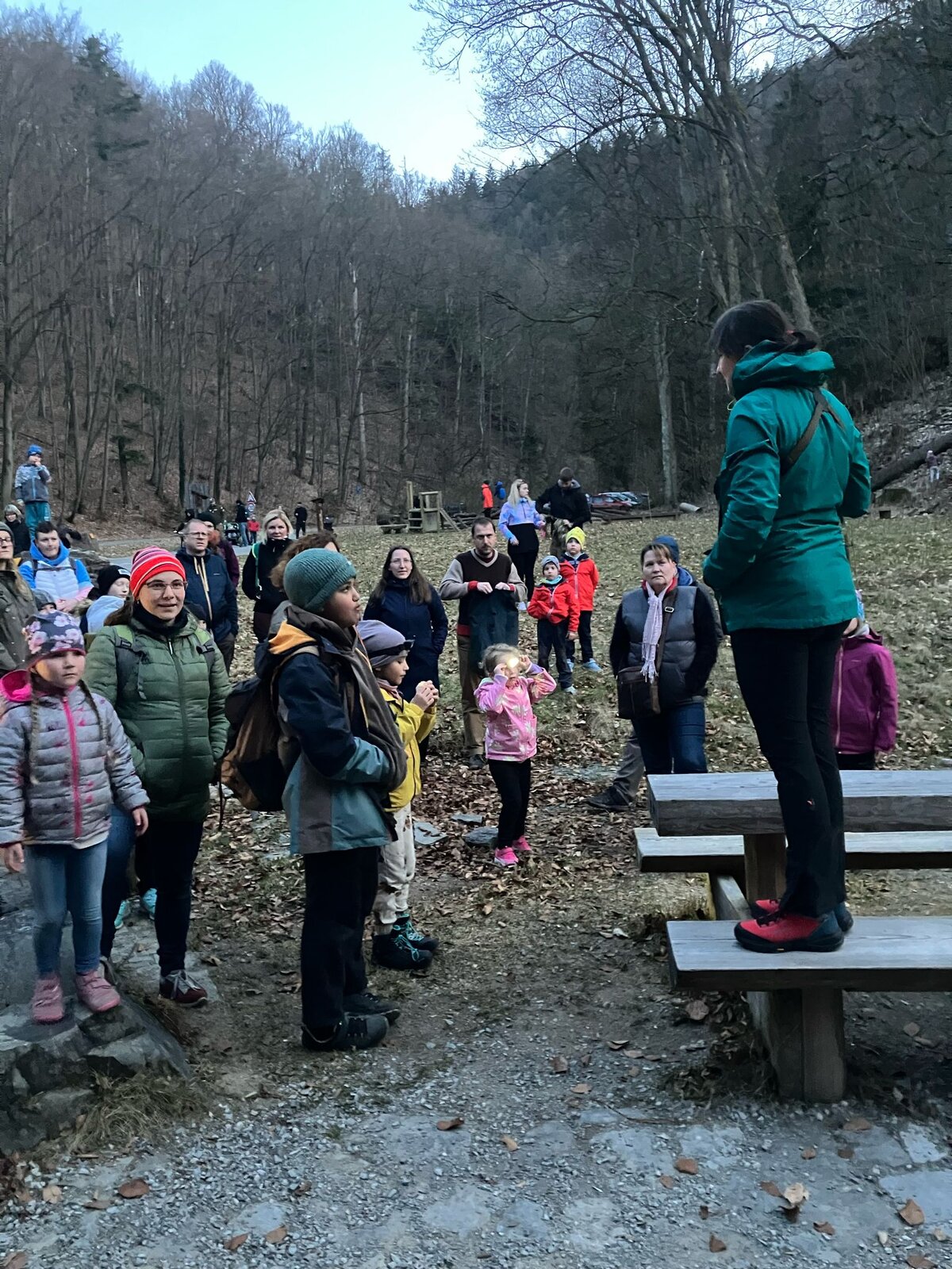 Po skončení přednášky se účastníci přesunuli do terénu. Těsně před setměním jsme se vydali na přibližně dvoukilometrovou vycházku do Suchého žlebu, kde jsme naslouchali nočním zvukům lesa. Během procházky bylo důležité zachovat naprosté ticho, aby bylo možné sovy zaslechnout. Pomocí tzv. vyhoukávání, tedy přehrávání zvuků sov z reproduktoru, se nakonec podařilo jednu z nich přivábit. Návštěvníci tak měli jedinečnou příležitost nejen slyšet, ale také zahlédnout puštíka obecného, který patří k nejčastějším sovám našich lesů.