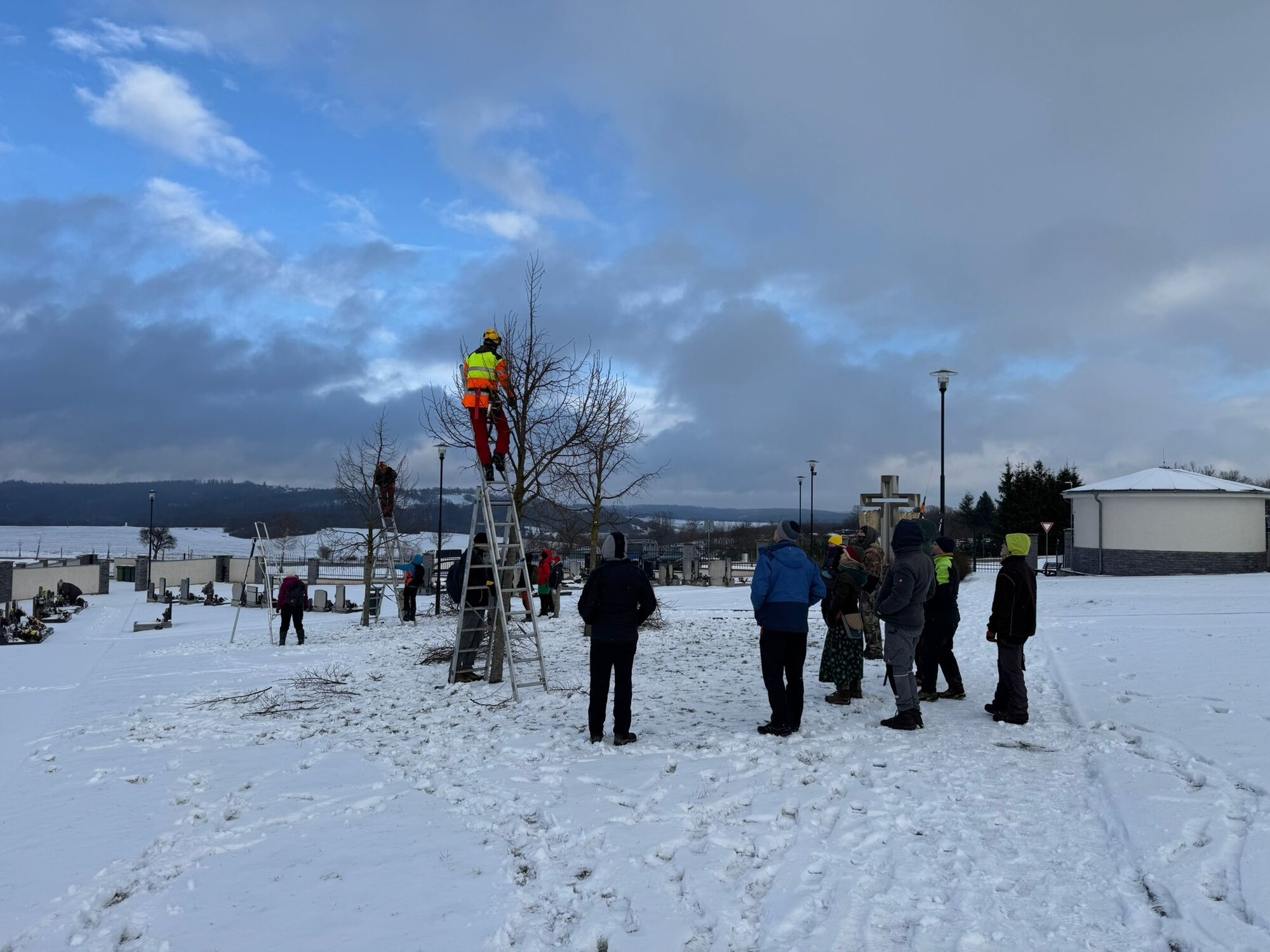 Významná část práce se zaměřila na stromy podél komunikací. Zde byl kladen důraz na výchovný řez, postupné zvyšování korun a tvorbu asymetrických korun tak, aby nedocházelo ke kolizím s dopravou a stromy byly dlouhodobě bezpečné. Součástí péče byla také revize kotvení a kontrola úvazů u mladých výsadeb, která pomáhá předcházet poškození kmenů třením. Specifická pozornost byla věnována také řezu neovocných stromů ve veřejném prostoru, například ve Vavřinci, kde se účastníci seznámili s principy péče vedoucí k jejich dlouhověkosti a stabilitě.