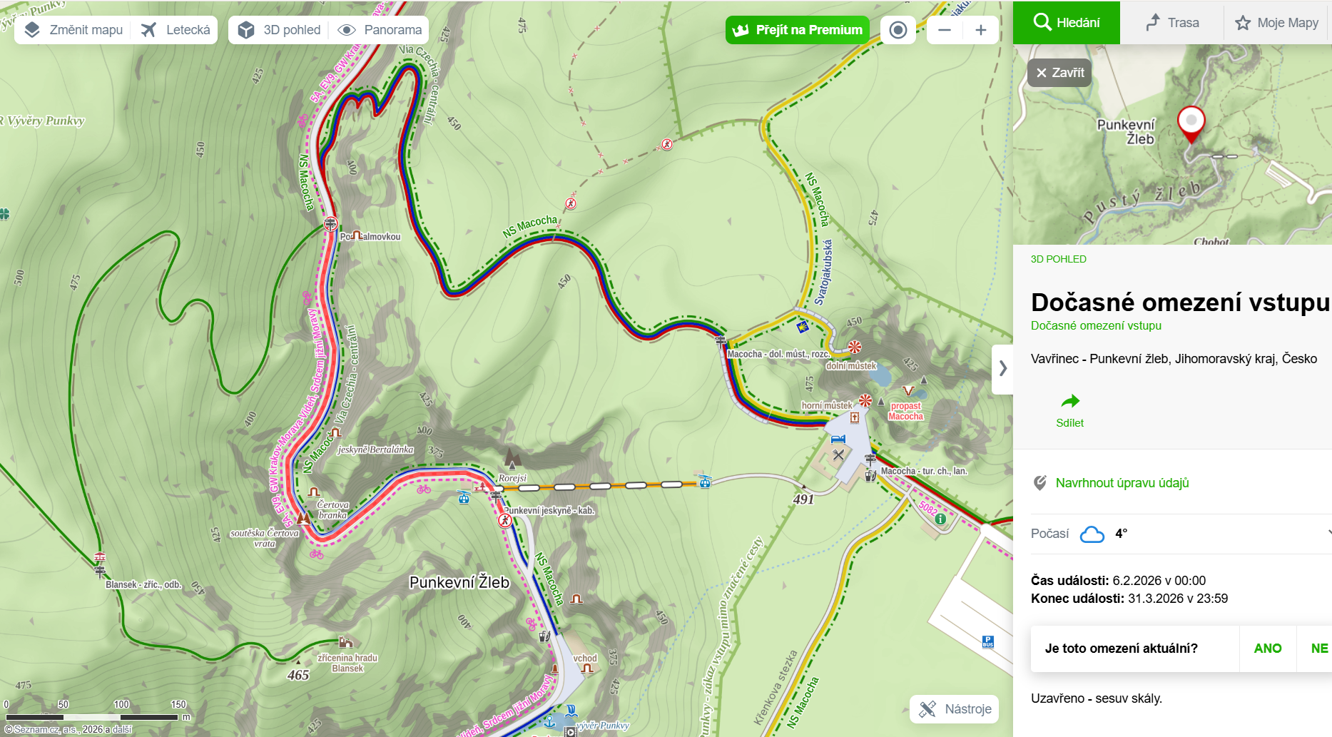 Lesy ČR ohrožený úsek cesty uzavřely. Lze procházet mezi Macochou a hradem Blansek přes turistickou křižovatku na dně Pustého žlebu kousek od skalního řícení a lze projít z této křižovatky do Sloupu. Nelze projít na Punkevní jeskyně.