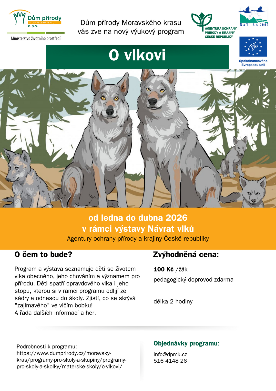 Program s výstavou vizuálně atraktivním způsobem seznamuje děti se životem vlka obecného, jeho chováním a významem pro přírodu. Vyvrací zažité mýty a nabízí řešení, jak zajistit co nejméně problematické soužití vlka s člověkem. Děti spatří opravdového vlkai jeho stopu, kterou si v rámci programu odlijí ze sádry a odnesou do školy. Zjistí, co se skrývá "zajímavého" ve vlčím bobku! Součástí programu jsou i hry na vlčí smečku, či poznávání pobytových znaků.
