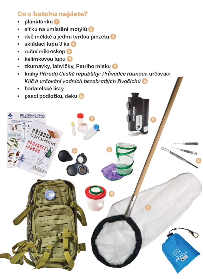 Vybavení batohu: planktonka • síťka na umístění motýlů • pinzety • skládací lupy • ruční mikroskop • kelímková lupa • zkumavky, lahvičky, Petriho misky • knihy Příroda České republiky: Průvodce faunou a Klíč k určování vodních bezobratlých živočichů • psací podložka • deka