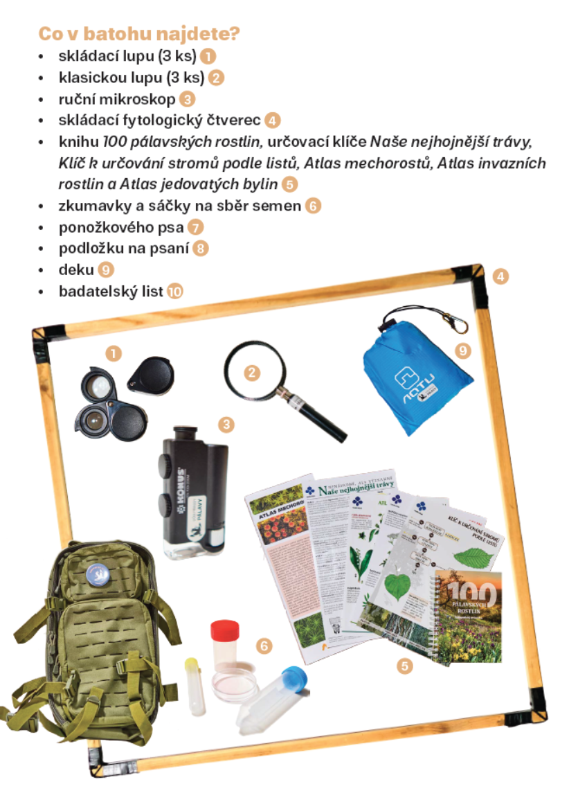 Vybavení batohu: skládací lupy • klasické lupy • ruční mikroskop • skládací fytologický čtverec • kniha 100 pálavských rostlin, určovací klíče Naše nejhojnější trávy, Klíč k určování stromů podle listů, Atlas mechorostů, Atlas invazních rostlin a Atlas jedovatých bylin • zkumavky a sáčky na sběr semen • ponožkový pes • podložka na psaní • deka