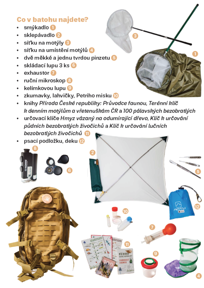 Vybavení batohu: smýkadlo • sklepávadlo • síťka na motýly • síťka na umístění motýlů • pinzety • skládací lupy • exhaustor • ruční mikroskop • kelímková lupa • zkumavky, lahvičky, Petriho misky • knihy Příroda České republiky: Průvodce faunou, Terénní klíč k denním motýlům a vřetenuškám ČR a 100 pálavských bezobratlých • určovací klíče Hmyz vázaný na odumírající dřevo, Klíč k určování půdních bezobratlých živočichů a Klíč k určování lučních bezobratlých živočichů • psací podložka, deka