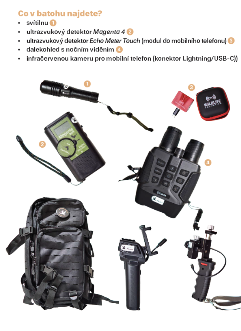 Vybavení batohu: svítilna • ultrazvukový detektor Magenta 4 • ultrazvukový detektor Echo Meter Touch (modul do mobilního telefonu s USB-C konektorem) • dalekohled s nočním viděním/infračervená kamera pro mobilní telefon*