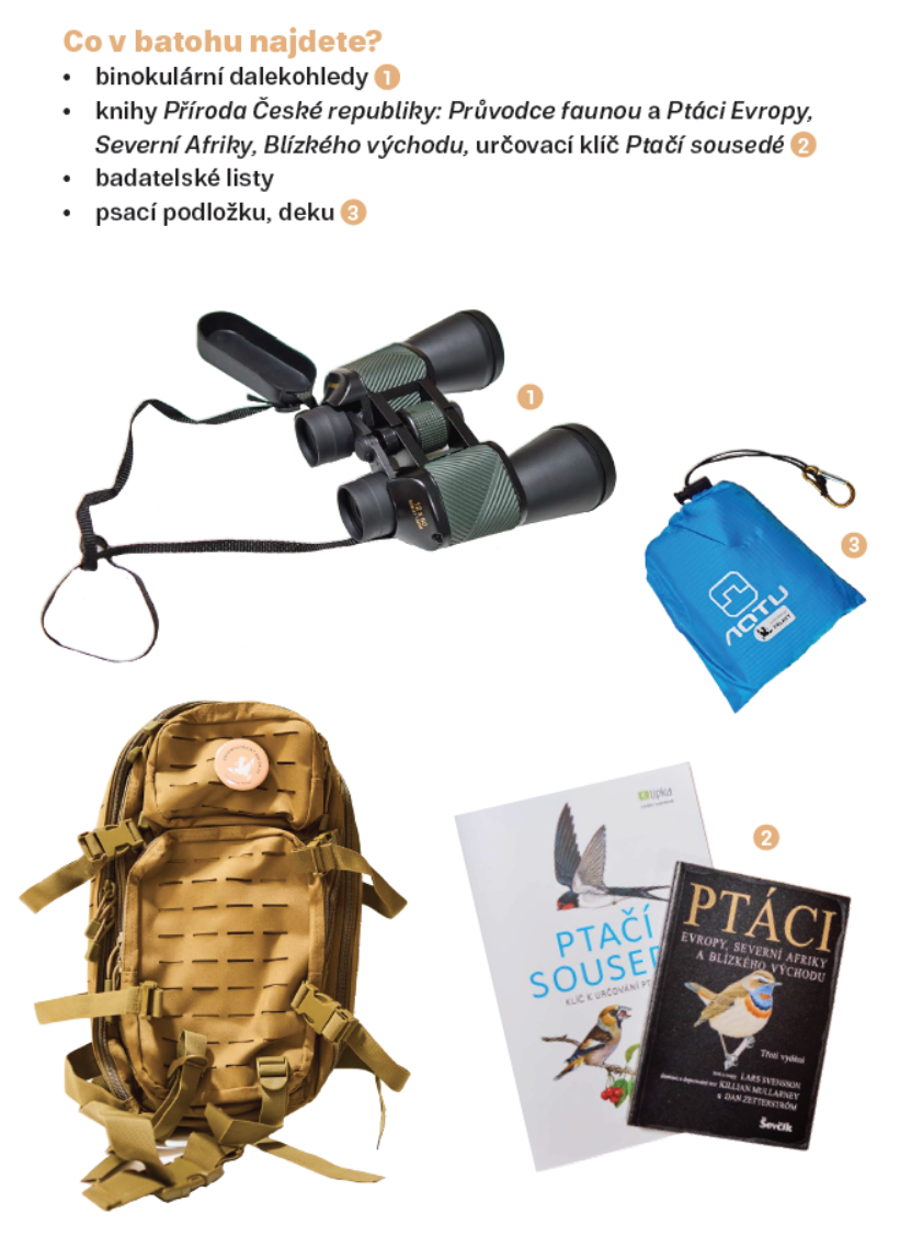 Vybavení batohu: binokulární dalekohledy • knihy Příroda České republiky: Průvodce faunou a Ptáci Evropy, Severní Afriky, Blízkého východu, určovací klíč Ptačí sousedé • psací podložka • deka